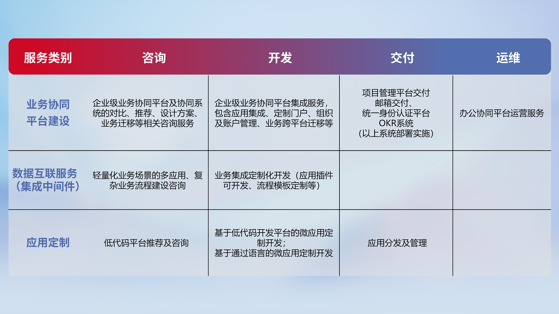 针对钉钉、、企微、、、IDaas等平台级产品提供产品的规划、、、、方案、、交付、、、定制化开发等服务,,,实现如统一协同办公、、、智能客户服务、、混合会议管理、、智能数据查询、、、、等业务场景,,,,实现数字化转型。。
