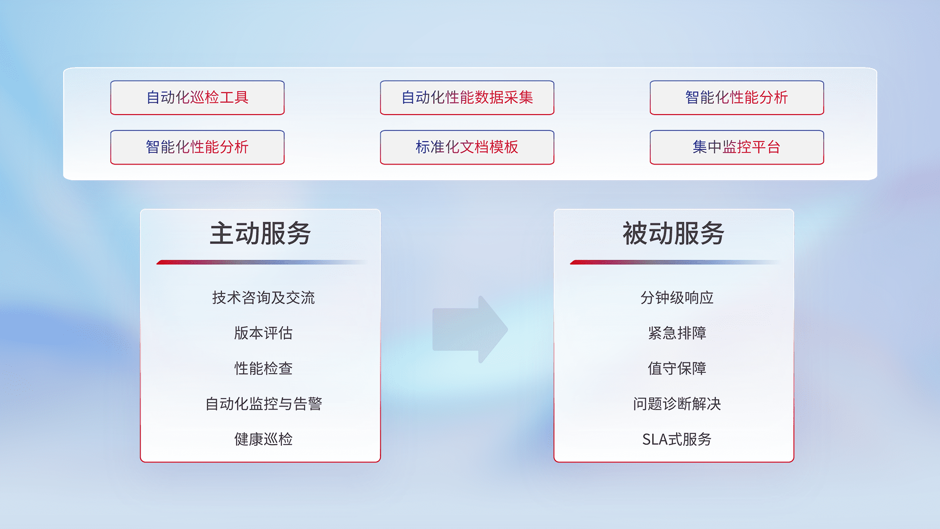 智能化工具和标准化文档,,,,保障服务质量,,提供主动服务(包含技术咨询、、、版本评估、、、性能检查、、自动化监控与告警、、、、健康巡检)和被动服务包含(分钟级响应、、、、紧急排障、、、、值守保障、、、问题诊断解决、、、、SLA服务)。。